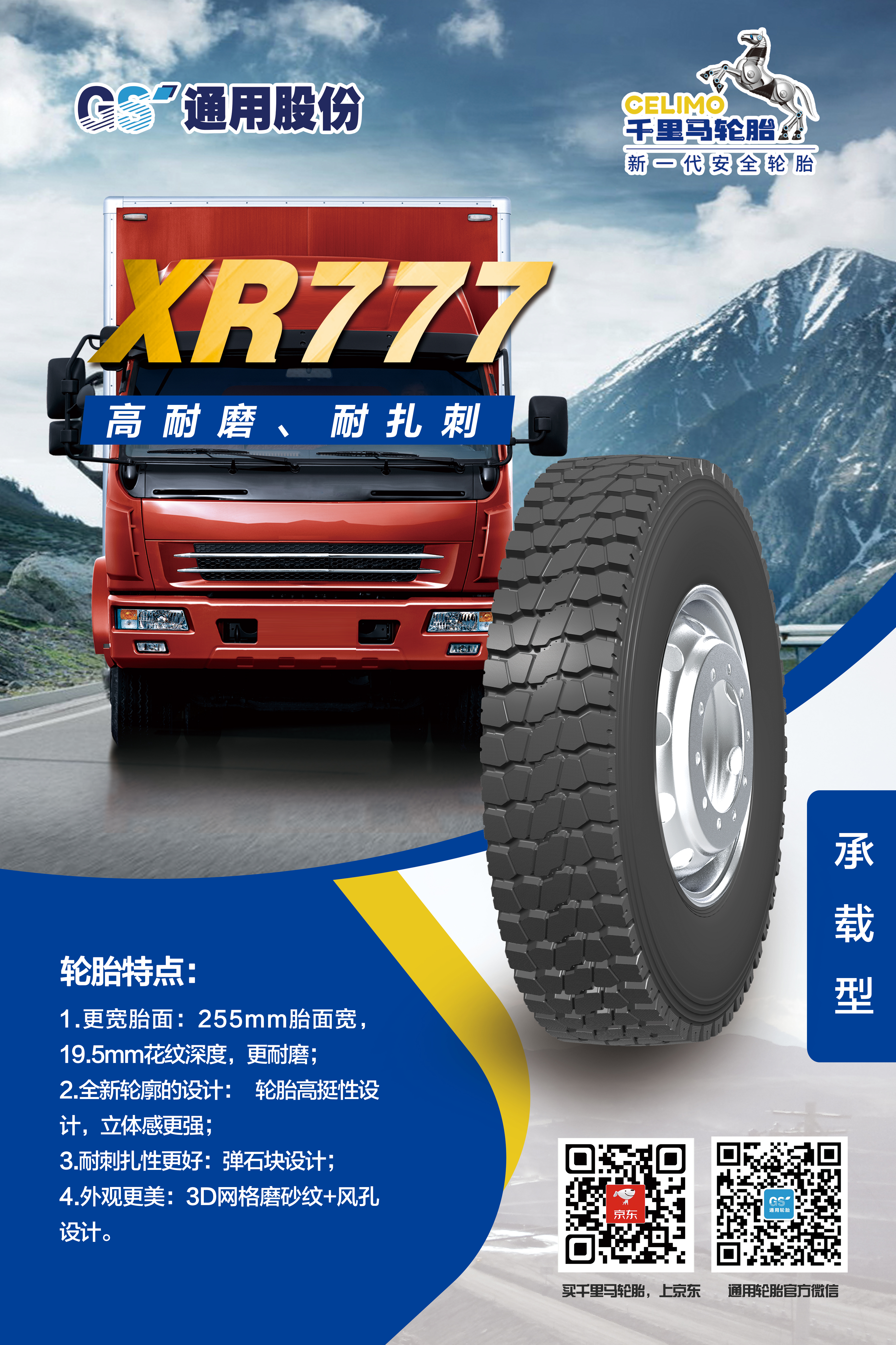 作為全新承載系列,XR666、XR777精準定位中短途貨物運輸需求,對輪胎花紋、配方、結構等進一步升級。輪胎應用獨特的彈石設計,即使在砂石路面,輪胎也具有更好的彈石效果,抗刺扎性能更佳。更強ST胎體骨架材料的應用,則為輪胎提供了更好的胎側剛性,輪胎更安全。