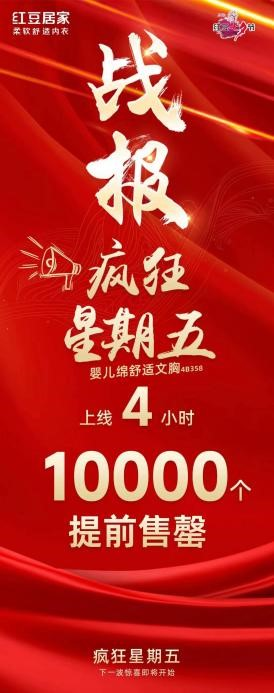 紅豆有禮,約“惠”七夕。7月下旬,在第24屆紅豆七夕節(jié)IP的強力加持下,紅豆居家通過精心策劃的“瘋狂星期五”營銷活動,每周精選一款兼顧舒適悅己與高性價比優(yōu)勢的品質(zhì)好物,限時秒殺、限量搶購,掀起了現(xiàn)象級消費熱潮。首波主推的嬰兒綿舒適文胸在短短10小時內(nèi)狂銷1萬件,第二波活動更攀新高,創(chuàng)下4小時售罄1.2萬件文胸的驕人戰(zhàn)績,再次證明了“紅豆”品牌背后的硬核產(chǎn)品力和強大市場吸引力。